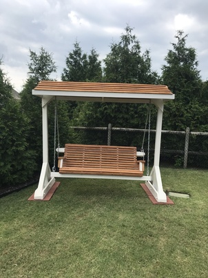 This beautiful swing has a full 60″ between the armrests, 24″ deep, and 24″ high. The frame is approximately 76″ high 8′ high and the base legs are 46.” Both are made of Pine or Douglas Fir (as is the canopy frame). The canopy slats are cedar. Three coats of exterior paint where appropriate and a sealer is used on the stained areas. Swing capacity less than 600 lbs. (You can request heavier for an additional price).